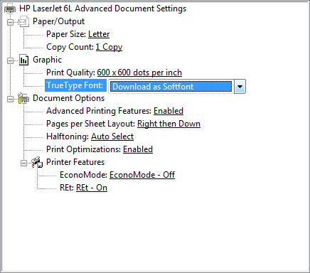 При разичните принтери/драйвери тази опция се казва по различен начин но резултата е един: не се ползват вградените шрифтовете на принтера, а се свалят от компютъра.alex написа: